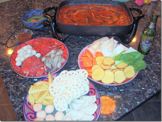 What a feast we had and there are lots of leftovers to keep the mouth tingle going. In the picture you can see the electric skillet filled with all things hot and spicy. To the left is a larger bowl containing garlic infused oil which is used to dip the food into, after it has been cooked, to help rinse off some of the peppers and spice. The smaller bowl contains what the package calls, "indispensable condiment" or hot pot sauce. Both Eammon and I found it quite dispensable and didn't bother with it. The upper left plate contains beef, shrimp, pork and quail eggs. The plate to the right contains mushrooms, baby bok choy, potatoes and sweet potatoes. The plate in the forefront contains lotus root, dumpling filled with a mixture of pork, shrimp and leeks, fish balls filled with shrimp and finally bamboo root. Then just for Eammon, a nice cold Tsingtao.