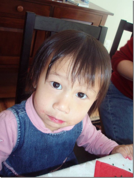 She loved the whole experience though, first playing with the huge train set that was in the waiting area, then being able to choose to sit in the fire truck, getting an animal cracker at the end of her haircut and finally choosing a bracelet from the treasure chest before leaving. They even put a foam sticky heart in her hair which she's still wearing four hours later. She just looks so adorable with her new do...not that I'm biased or anything!